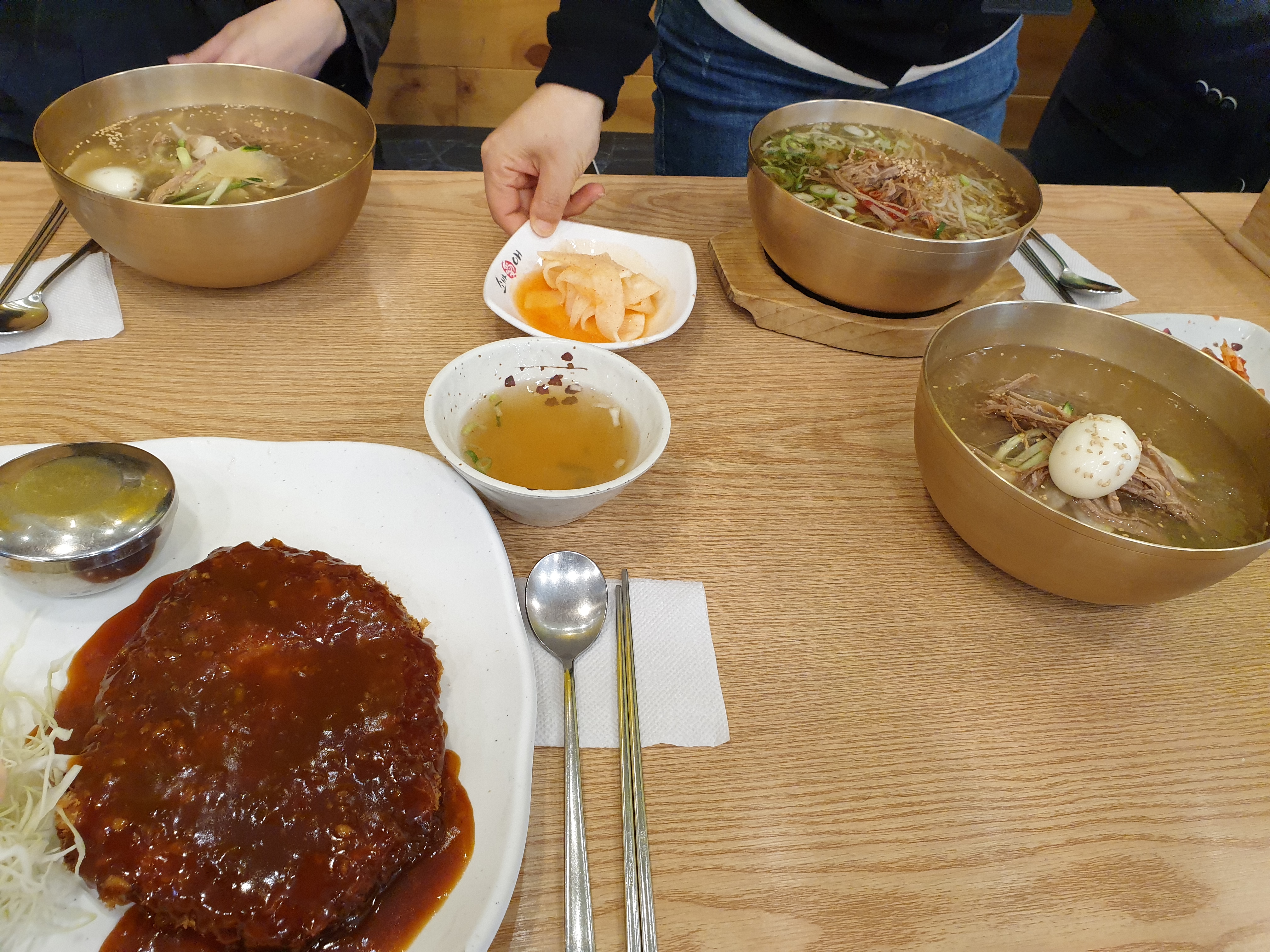 메뉴는 냉메밀, 비빔메밀, 온메밀, 이 중에서 냉메밀 2개, 온메밀 1개, 돈가스, 이렇게 시켰고요.